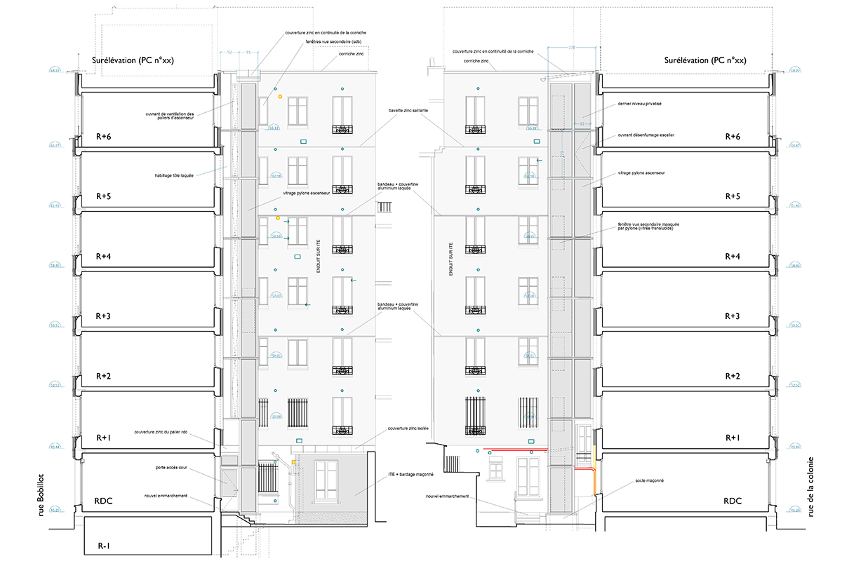 Rénovation thermique d’un immeuble des années 1910 et création d’un ascenseur commun sur cour. 18 logements + 1 local commercial à rez-de-chaussée.
