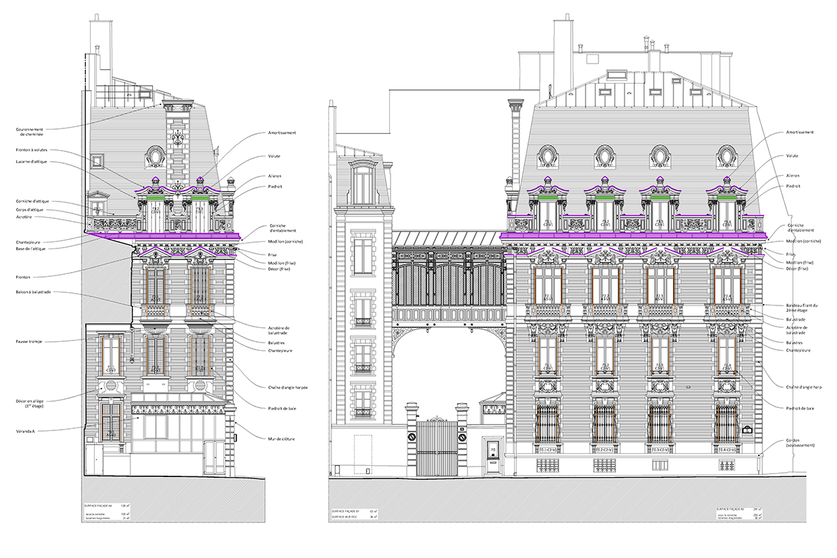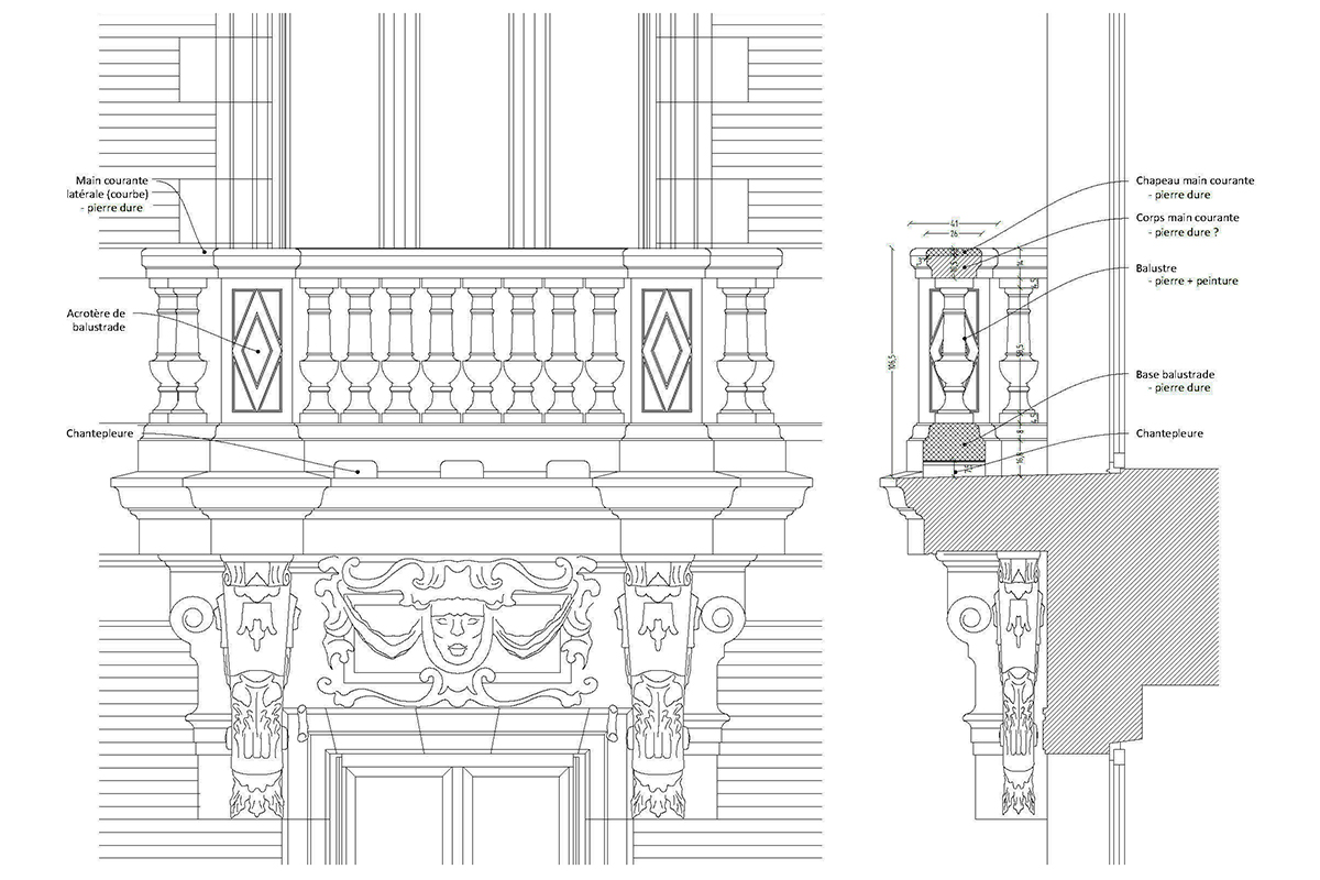 Ravalement des façades et restauration des décors sculptés en pierre de taille. Correction thermique des façades enduites / Réfection des couvertures ornées (plomb et zinc) / Restauration de la passerelle, des vitraux et des parements décoratifs en fonte moulée. Travaux en site occupé.