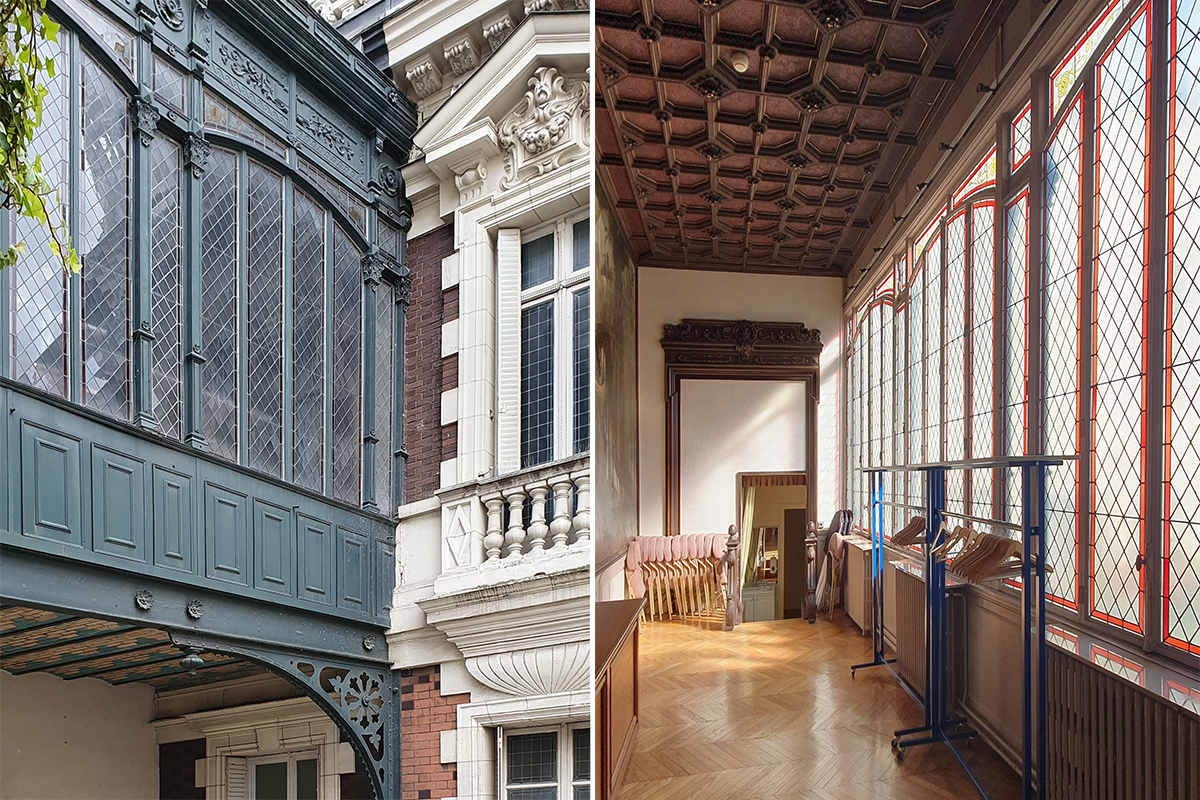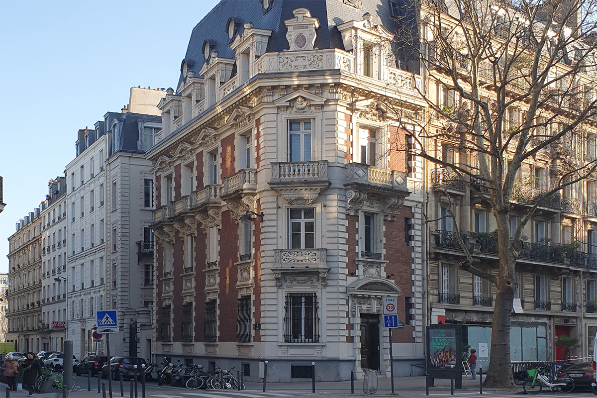 Hôtel des années 1880 – Façades en briques et pierre de taille – Façades en maçonneries enduites – Passerelle portant vitraux en en structure métalliques avec décors en fonte moulée.